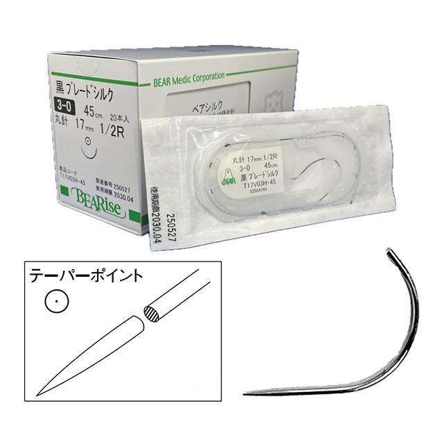 ●商品コード: 3941884●入数: 20本●メーカー型番: T19V03GCC-45●先端形状: テーパーポイント●針長: 19mm●湾曲: 逆クロソイド●USP.No: 3-0●糸長: 45cm●材質: 絹●糸色: 黒●販売名: ブレードシルク糸付縫合針●薬事表示番号: 医療機器承認番号23000BZX00205000