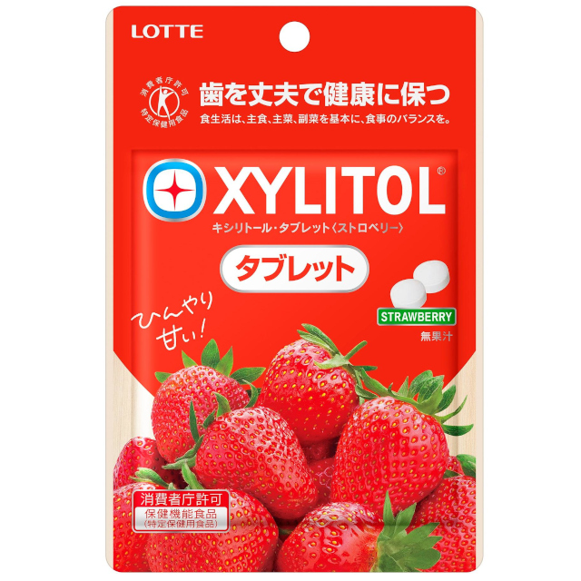 歯を丈夫で健康に保つ特保のキシリトールタブレット。ジャム感のあるいちごの甘い香りとキシリトールのやさしい甘さが広がります。