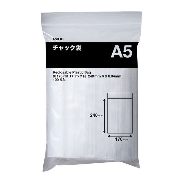 ●商品コード: 1352448●入数: 100枚●サイズ: A5(170×240mm)●入るものの大きさ目安: A5用紙