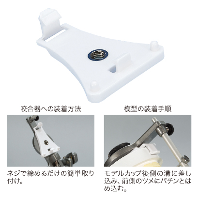 咬合器へワンタッチで脱着できるアダプター。 わずらわしい脱着作業から解放され、作業に伴う余剰石膏も削減できます。