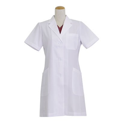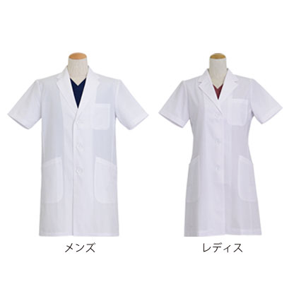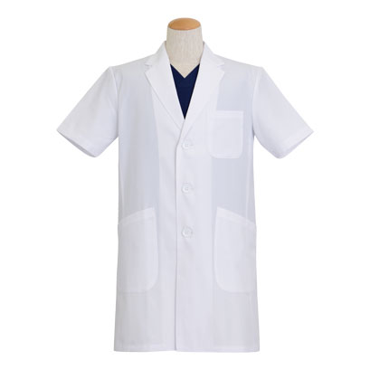 洗濯してもアイロンなしで着用できる、 シャキッとした軽め素材の半袖診察衣。