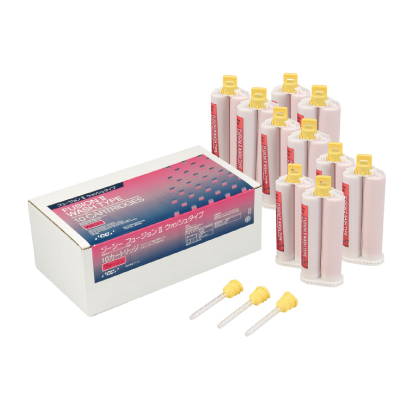 ●商品コード: 8203532●入数: 1ケース●タイプ: ウォッシュ●セット内容: カートリッジ62g(48ml)×10、ミキシングチップⅡSS×40●販売名: ジーシー フュージョンⅡ ウォッシュタイプ●薬事表示番号: 医療機器認証番号220AABZX00013000