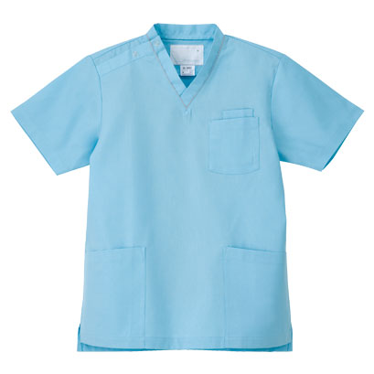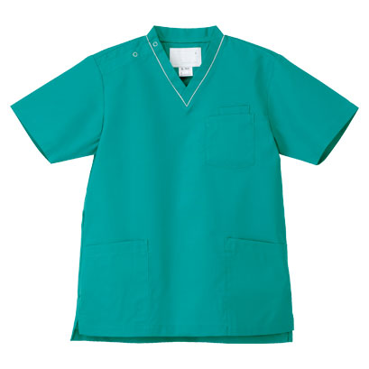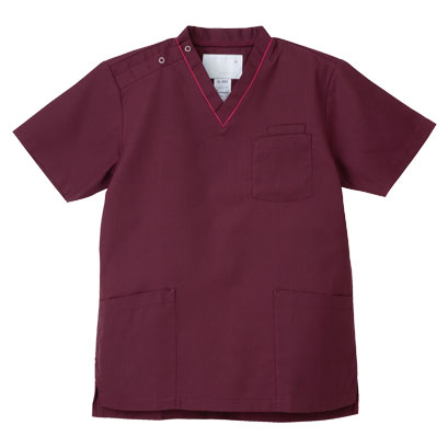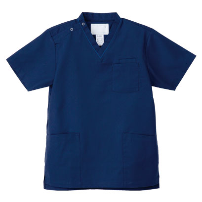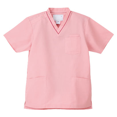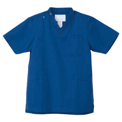 襟元のパイピングが爽やかで 清潔感のある綿混スクラブ。