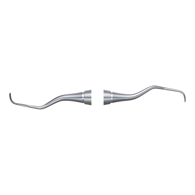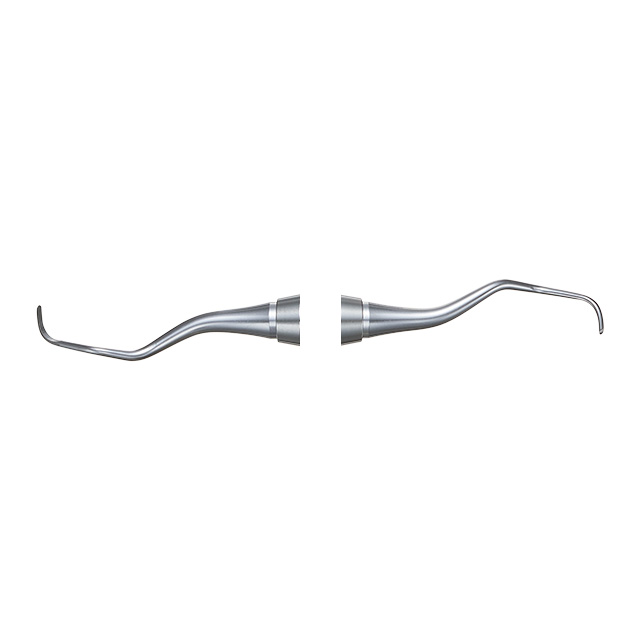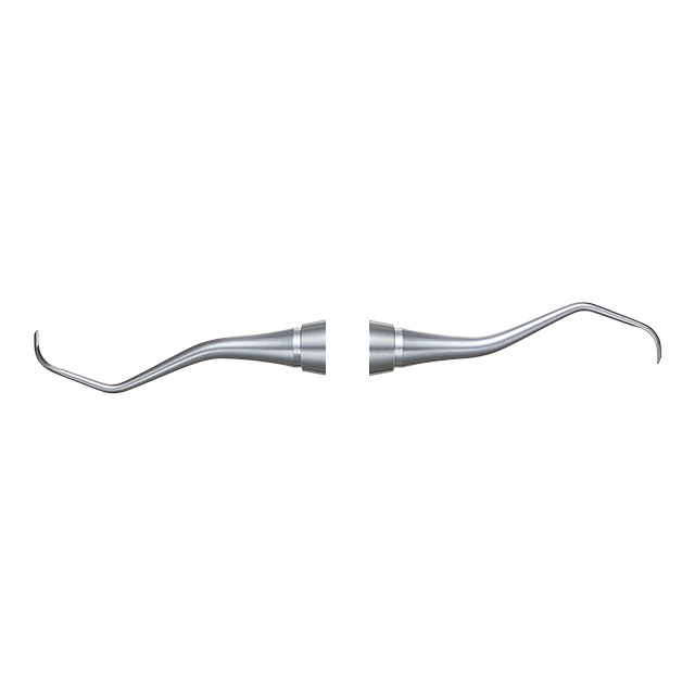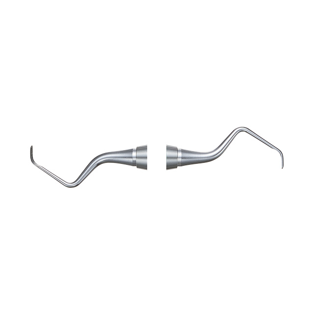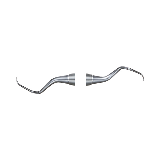 ブレード部が小さく、第1シャンクが長いため、狭く深いポケットへの挿入や、隅角部、根分岐部での操作がしやすいです。強固な歯石にも対応し、超音波スケーリング後の取り残しにも有効です。