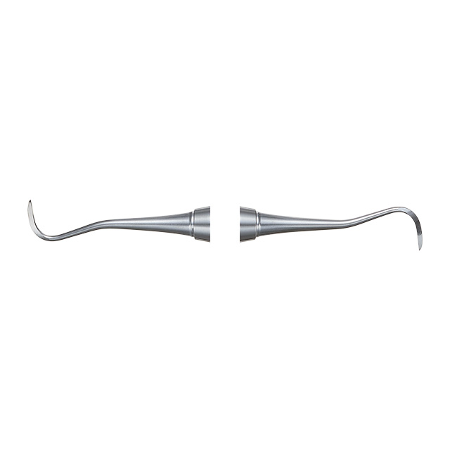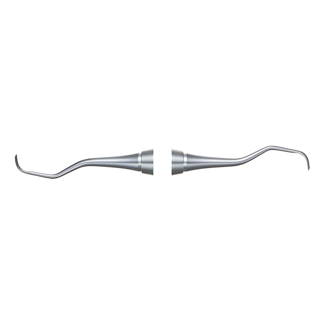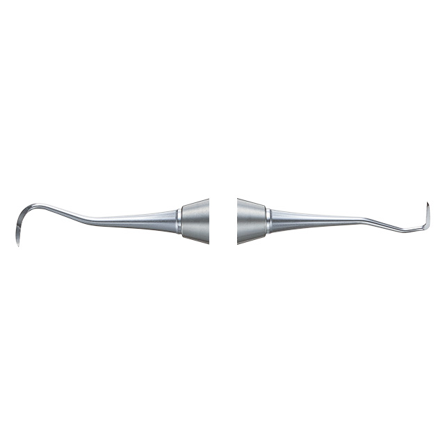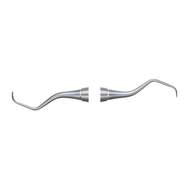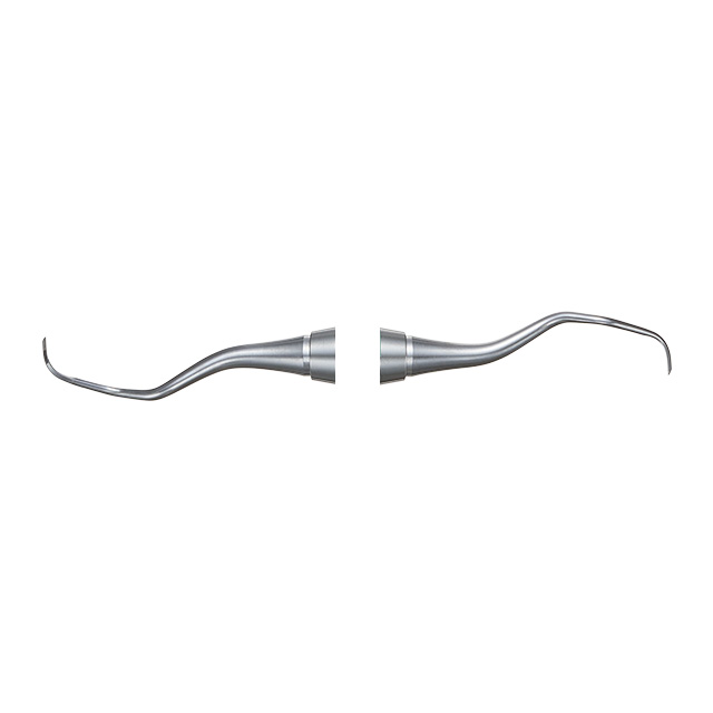 ブレード部が小さく、第1シャンクが長いため、狭く深いポケットへの挿入や、隅角部、根分岐部での操作がしやすいです。強固な歯石にも対応し、超音波スケーリング後の取り残しにも有効です。