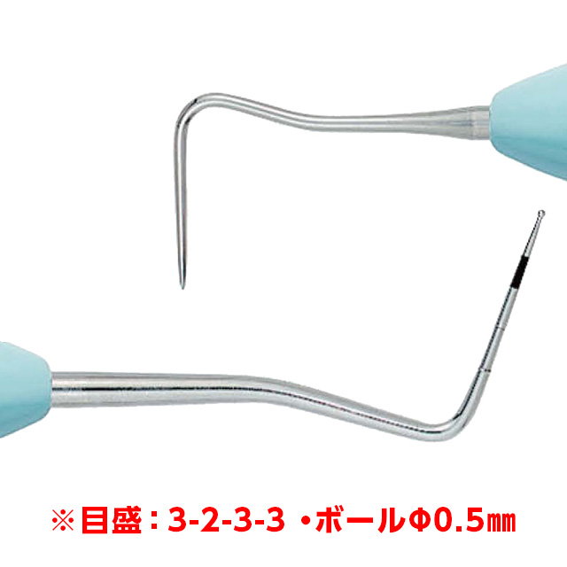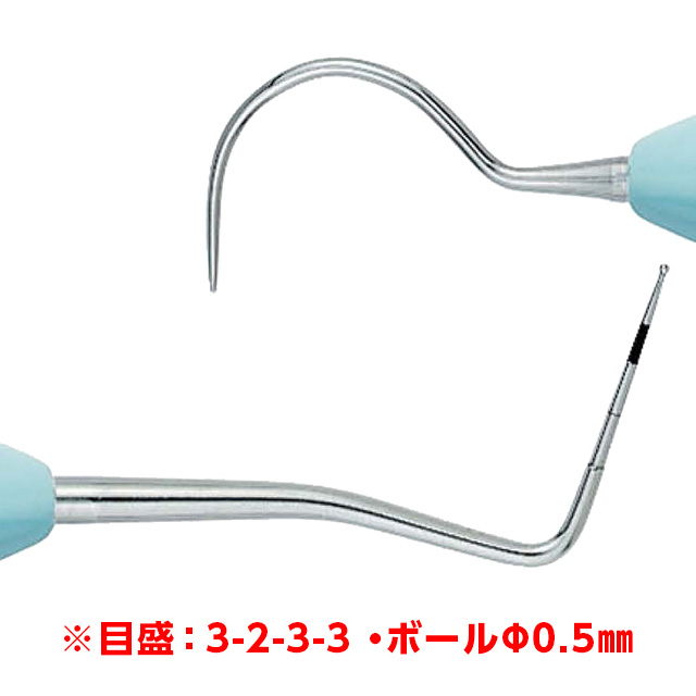 ●商品コード: 9065211●入数: 1本●ハンドルタイプ: Si エルゴノーム(ノーマル)●タイプ: 両頭●目盛: 3-2-3-3 / ボール Φ0.5㎜●販売名: LM ペリオプローブ●薬事表示番号: 医療機器届出番号27B1X00020221009
