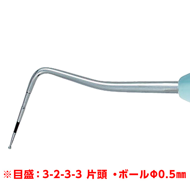●商品コード: 9063925●入数: 1本●ハンドルタイプ: Si エルゴノーム(ノーマル)●タイプ: 片頭●目盛: 3-2-3-3 / ボール Φ0.5㎜●販売名: LM ペリオプローブ●薬事表示番号: 医療機器届出番号27B1X00020221009