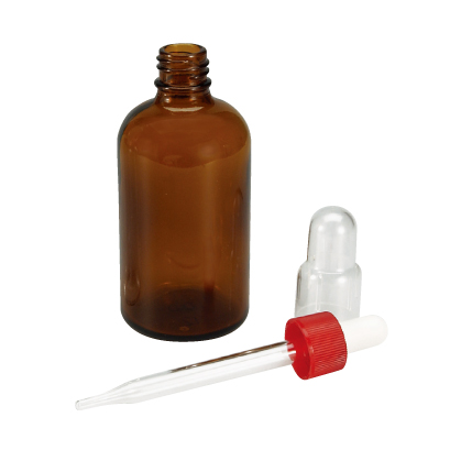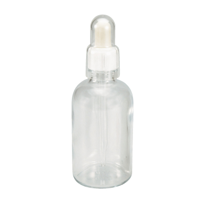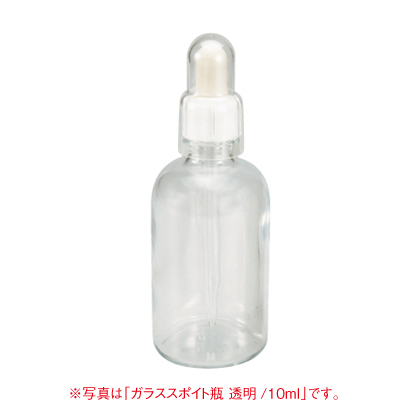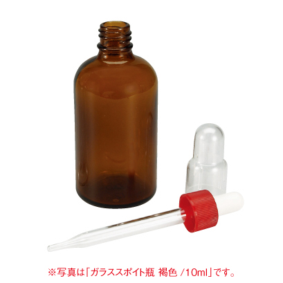 キャップ部分にスポイトが付いている、丸型の細口ガラス瓶です。