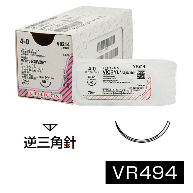 ●商品コード: 3004616●入数: 12本●針(先端形状): 逆三角針●湾曲: 弱湾3/8●材質: ポリグラチン910●メーカー型番: VR494●形態番号: P-3●針長: 13mm●号数: 4-0●糸長: 45cm●糸色: 白●販売名: バイクリルラピッド●薬事表示番号: 医療機器承認番号20700BZY00543000